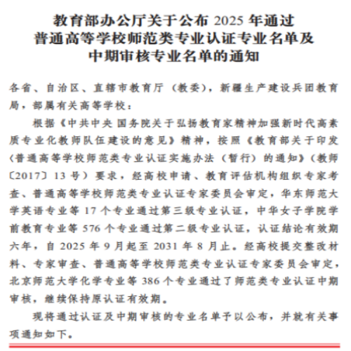 近日,教育部办公厅正式发布了《关于公布2025年通过普通高等公司师范类专业认证名单及中期审核专业名...