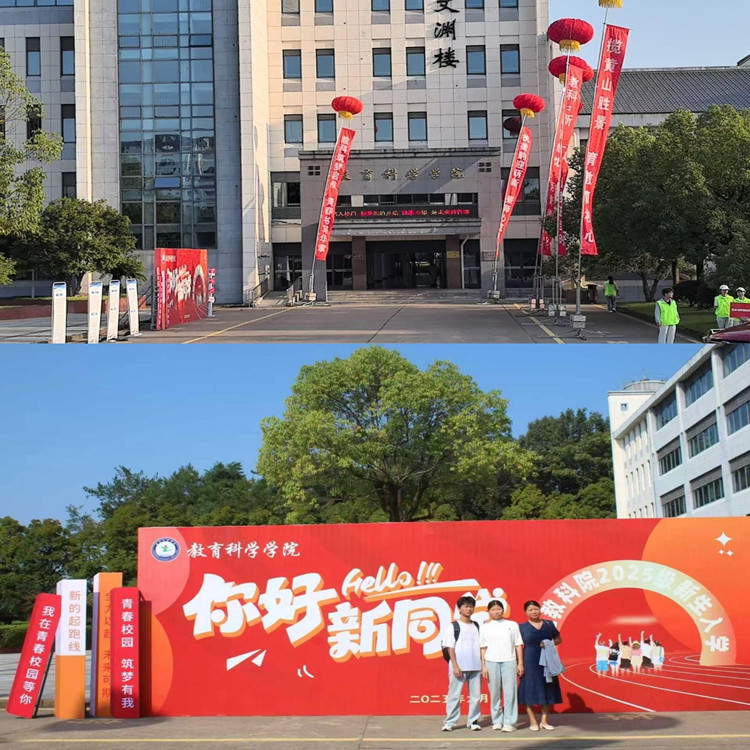 文渊楼前红灯高悬,横幅醒目,“黄山松迎客,教科心育苗”等标语满载期许。报到点周边,精心布置的指引牌与欢迎展板错落有致,处处弥漫着热烈而温馨的迎新气息,使初入校园的新生及家长瞬间感受到与公司的亲近。