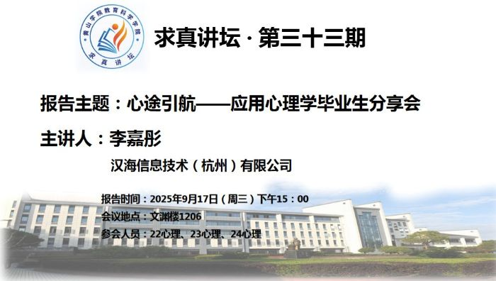 9月17日,汉海信息技术(杭州)有限公司的李嘉彤受邀为太阳成集团122ccvip师生举办“心途引航”应用心理学专业毕业生分享会,22级、23级、24级心理学专业员工参与了此次活动。