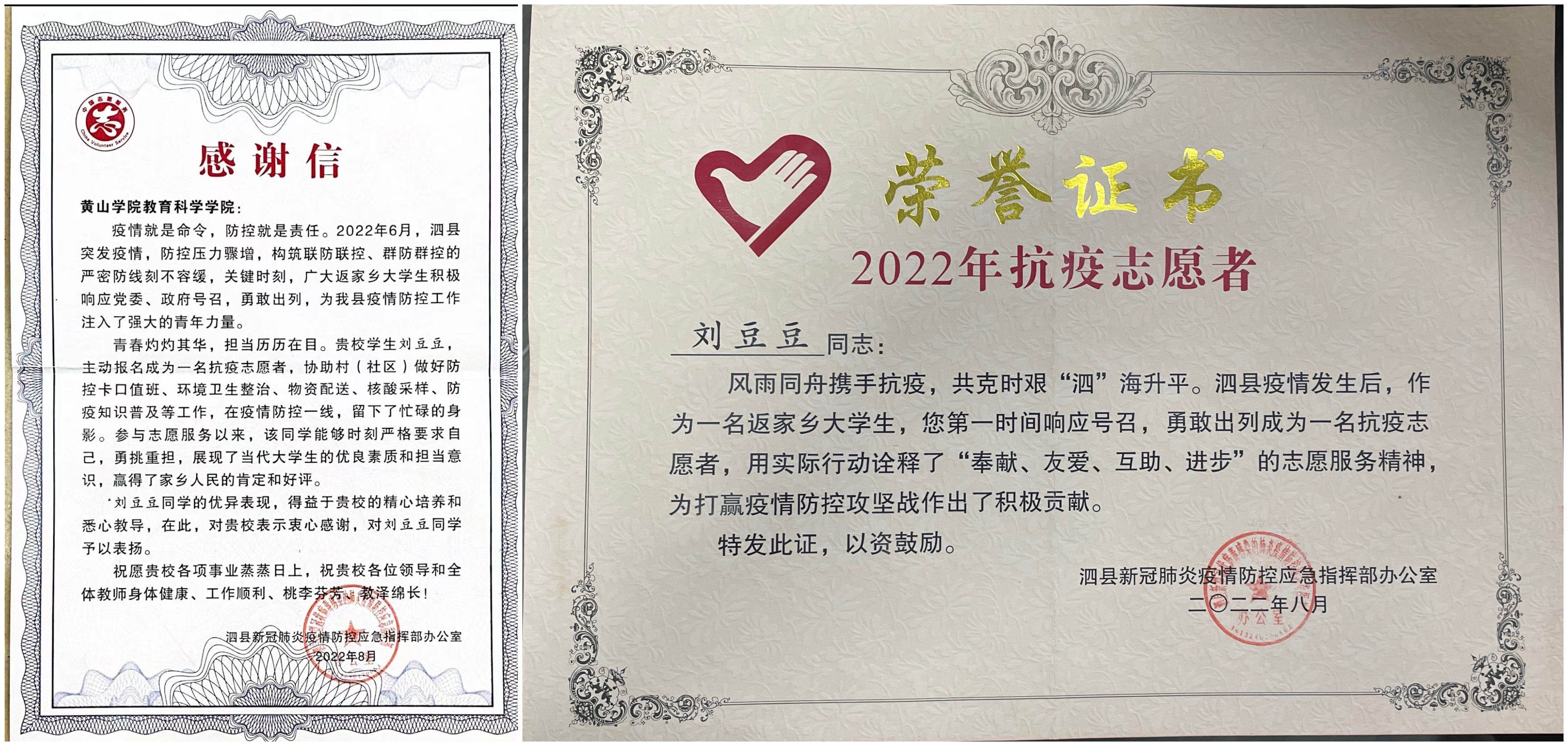 近日,太阳成集团122ccvip收到泗县新冠肺炎疫情防控应急指挥部办公室发来的感谢信,感谢公司2021级小学教育专业刘豆豆同学在疫情防控工作中做出的突出贡献,充分肯定了太阳成集团122ccvip青年学子的奉献精神与责任担当意识。