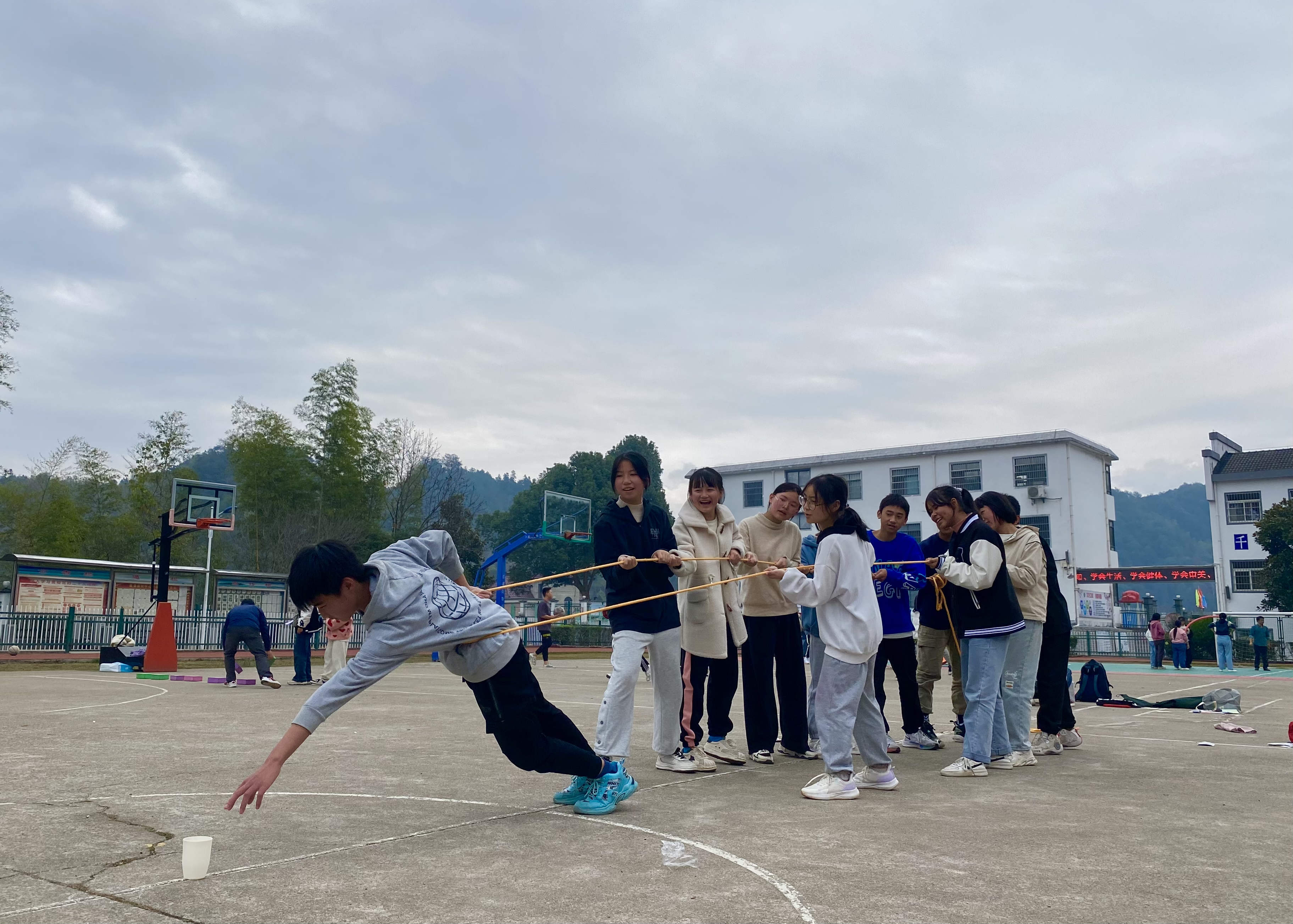 全体同学在明确了各项活动规则后分组开展活动。蒙眼互打,尽情宣泄;团队过河,互助协调;滚铁环接力,乐不可支;绑腿并进,齐心协力;急速六十秒,分秒必争;车轮滚滚,奔腾不息;同手同脚,协同并进;雷区取水,从容不迫;滚球接力,协调一致;知识问答,自我认知。十项活动有趣交叉进行,操场上一派欢声笑语。最后率先完成活动的六个小组分别获得了一、二、三等奖。获奖的同学还与领导教师一起合影留念,活动在全体同学的欢呼声中落下帷幕。