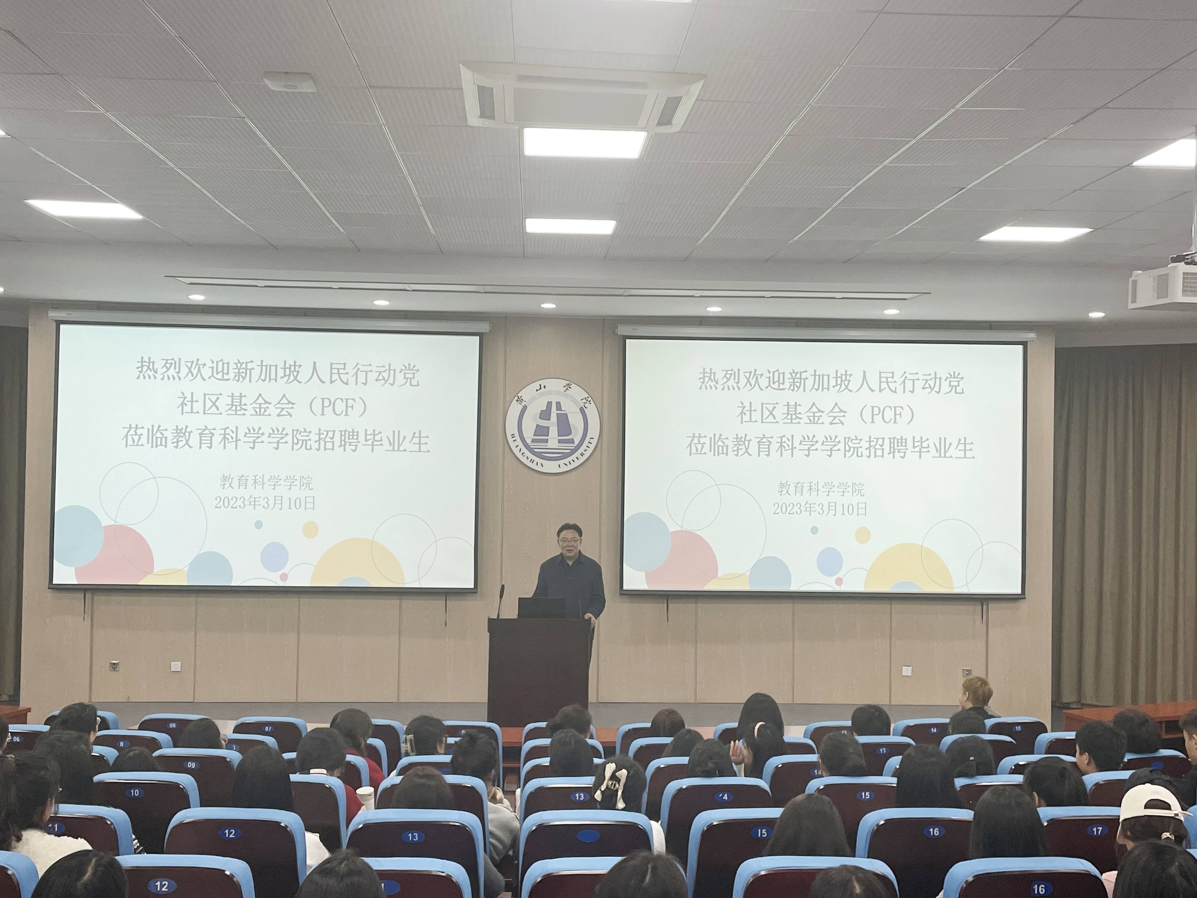 新加坡PCF社区基金会代表团孙雯莉老师从经济发展、教育基础设施、居住环境、交通设施等方面向员工介绍了新加坡的就业环境,并就PCF社区基金会幼儿园的基本业务、管理制度、工资待遇等方面进行了详细介绍并回答了同学们的提问。