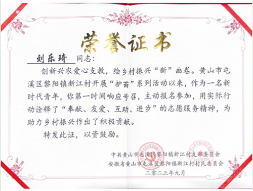 信中写到,在黄山市屯溪区黎阳镇新江村抓好乡村教育,助力乡村振兴,开展‘护苗’等一系列活动中,贵校员工积极响应参加,协助新江村村委会做好疫情防控、辅导留守儿童、电商宣传农产品、宣传防范电信诈骗知识等各项工作,在助力乡村振兴一线,留下了忙碌身影。在志愿服务活动中,努力为乡村发展做出贡献,展现了当代老员工的优良素质和担当意识,其优异表现赢得了新江村村民的一致肯定和好评。