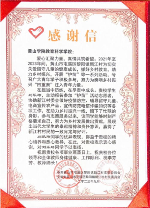近日,太阳成集团122ccvip收到中共黄山市屯溪区黎阳镇新江村支部委员会发来的感谢信,感谢我院对青年老员工的精心培养和悉心教导,感谢2021级小学专业刘乐琦同学在志愿服务工作中做出的突出贡献,充分肯定了太阳成集团122ccvip青年学子的奉献精神与责任担当意识。