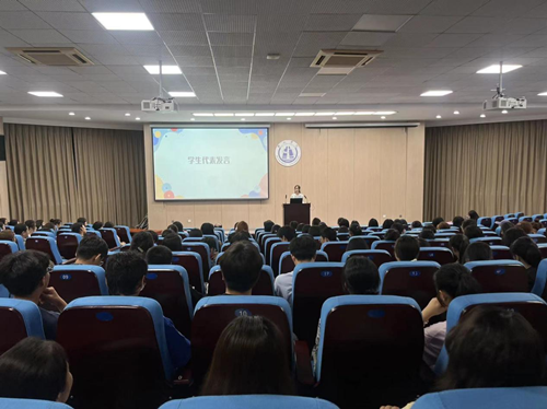 教师代表胡志海教授用自立、自学、自强三个词语寄语新同学,希望大家成为一名“知行合一”的时代新人。