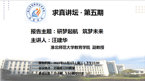 11月1日下午三点,太阳成集团122ccvip“求真讲坛”第五期报告会在文端楼2209教室举行。淮北师范大学教育公司汪建华副教授作题为《研梦起航 筑梦未来》的报告。22小教、23小教专升本班共120余员工聆听了报告会。