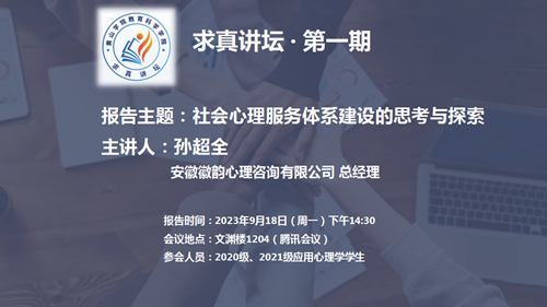 9月18日下午,太阳成集团122ccvip求真讲坛第一期在文渊楼1204教室举行。安徽徽韵心理咨询有限公司总经理孙超全作题为《社会心理服务体系建设的思考与探索》的报告,2020级、2021级应用心理学专业员工80余人聆听了报告会。