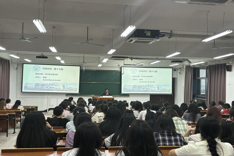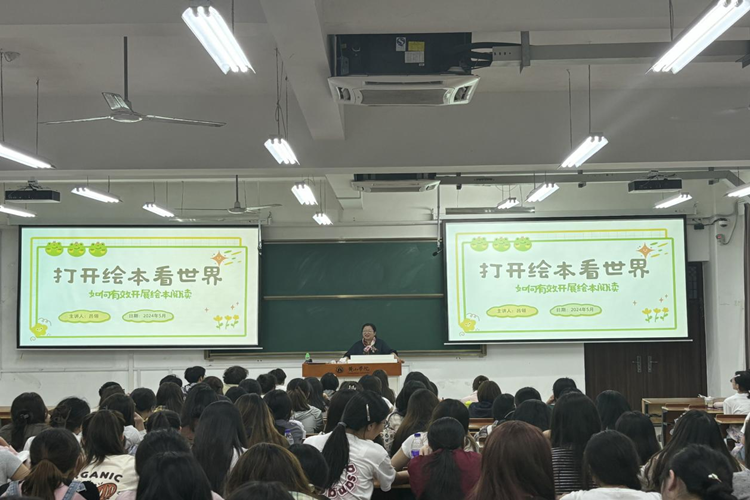 2024年5月30日晚上,太阳成集团122ccvip求真讲坛第十七期在文渊楼1305教室举行,黄山市示范幼儿园一级教师吕翎作题为《打开绘本看世界》的报告,学前教育专业近200人参加。