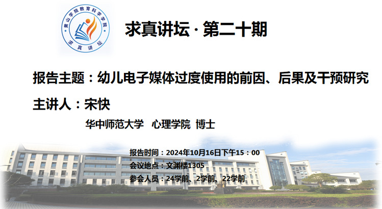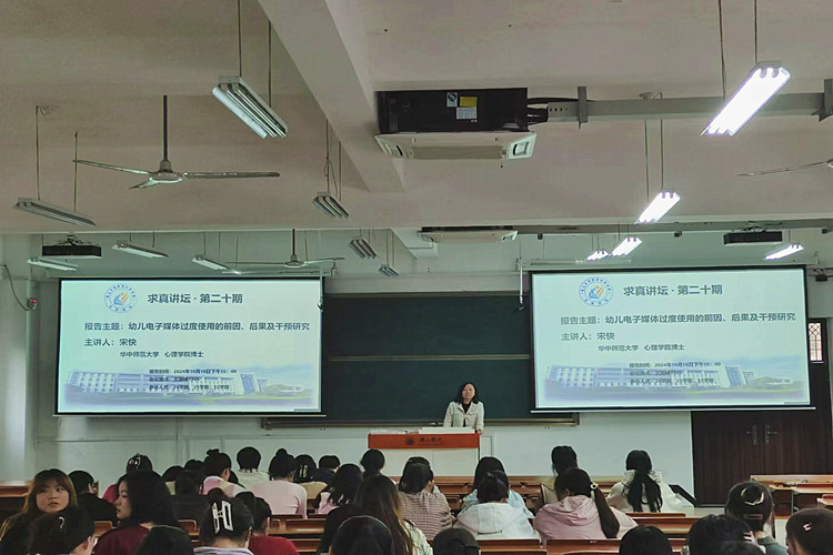 10月16日下午,太阳成集团122ccvip求真讲坛第二十期在率水校区文渊楼1305教室举行。华中师范大学心理公司宋快博士应邀通过线上的方式,为公司学前教育专业员工作题为“幼儿电子媒体过度使用的前因、后果及干预研究”的学术报告。报告会由学前教育专业教师曹旸主持,学前教育专业150余名员工参加了报告会。
