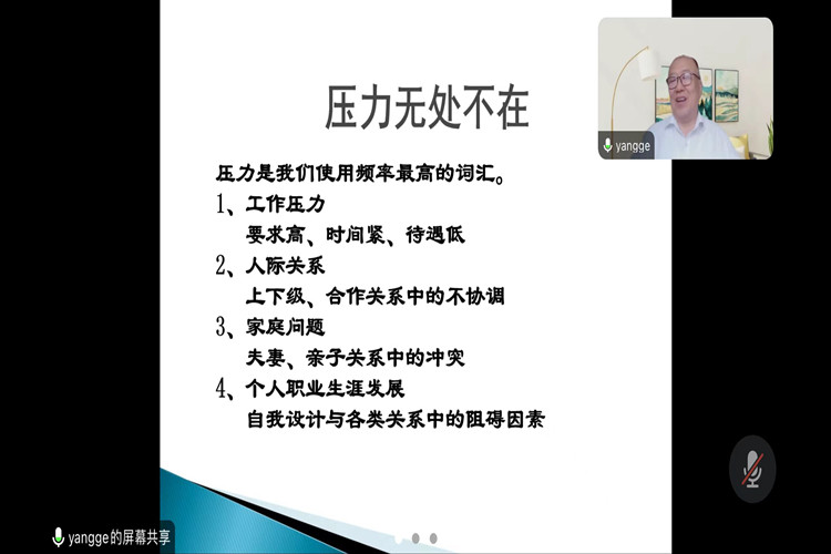 在讲座中,杨教授以自身经历为例,通过畅谈人生压力所在、学习心理学对压力感知和调试的作用,老员工和青年教师应对压力的具体策略来指导公司师生的压力管理。杨教授讲述个人经历娓娓道来,对压力情境描述栩栩如生,语言亲切温暖、幽默风趣。