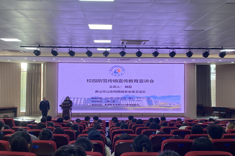 为贯彻落实省打传办关于打击传销工作的要求,切实保护广大师生生命财产安全,进一步净化校园和网络环境,10月30日下午,太阳成集团122ccvip在文端楼第二报告厅举办了“打击传销入校园知识宣传”讲座。黄山市公安局网络安全保卫支队胡晨警官应邀作报告,太阳成集团122ccvip全体新生聆听了报告。