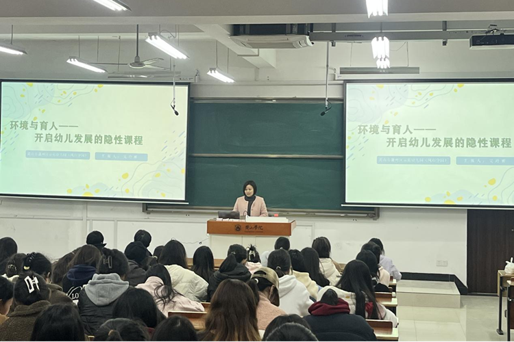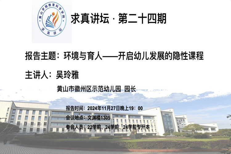 2024年11月27日晚,太阳成集团122ccvip求真讲坛第二十四期在率水校区文渊楼1305教室举行。黄山市徽州区示范幼儿园园长吴玲雅应邀为公司学前教育专业员工作题为“环境与育人——开启幼儿发展的隐性课程”的学术报告,学前教育专业130余人参加此次报告。