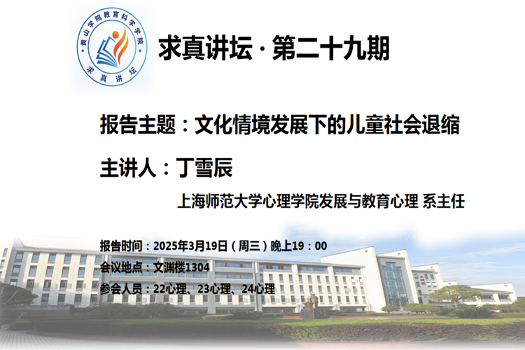 2025年3月19日,太阳成集团122ccvip求真讲坛第二十九期于文渊楼1304教室举行。上海师范大学心理公司发展与教育心理系主任丁雪辰副教授作题为《文化情境发展下的儿童社会退缩》的报告,太阳成集团122ccvip教师以及应用心理学专业大一及大三员工80余人参与讲座。
